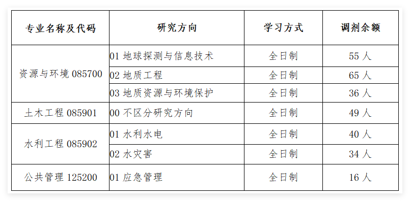 (四)调剂考生初试科目应与我校招生专业初试科目相同相近,资源与环境专业统考科目为思想政治理论、英语二、数学二,专业课为普通地质学;调剂考生统考科目应为思想政治理论,英语一或英语二,数学一或数学二或数学三,自命题科目应与该专业自命题科目相同相近。土木工程专业统考科目为思想政治理论、英语二、数学二,专业课为材料力学;调剂考生统考科目应为思想政治理论,英语一或英语二,数学一或数学二或数学三,自命题科目应与该专业自命题科目相同相近。水利工程专业统考科目为思想政治理论、英语二、数学二,专业课为水力学;调剂考生统考科目应为思想政治理论,英语一或英语二,数学一或数学二或数学三,自命题科目应与该专业自命题科目相同相近。公共管理专业统考科目为管理类综合能力、英语二,无专业课;调剂考生统考科目应为管理类综合能力、英语二或英语一,无专业课。